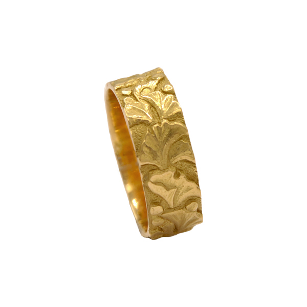 Alliance/anneau en or jaune, création réalisée à partir de ciselures réalisées à la main illustrant des des feuilles de Ginkgo.